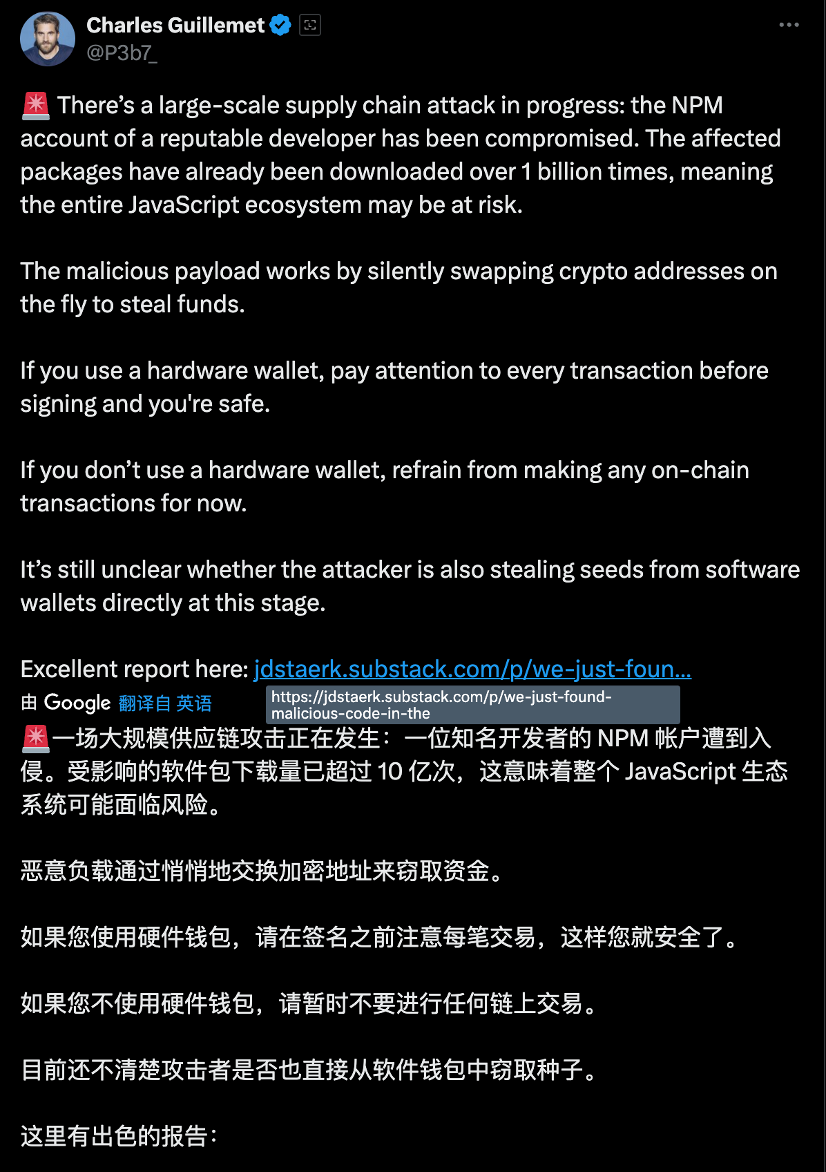 今天早上刚看到的说npm遭受了生态有史以来最大规模的供应链攻击事件,攻击者通过钓鱼邮件入侵长期受信任的维护者qix的账户,篡改了包括chalk、debug和ansi-styles在内的18个流行软件包,这些软件包每周总下载量超过20亿次。